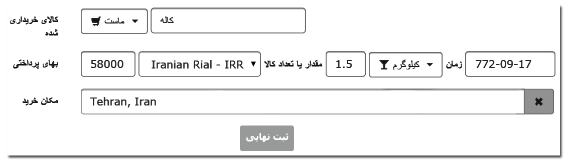 موارد مربوط به خرید کالای مورد نظر خود را به دقت وارد کرده و دکمۀ ثبت نهایی را بزنید. در نظر داشته باشید که پس از ثبت نهایی بهای مورد نظر خود امکان اصلاح آن وجود ندارد. برای اصلاح هر مورد نادرست باید با زدن بر روی علامت ضربدر روبروی آن، آنرا به کلی حذف کرده و دوباره از نو تمامی داده های مربوط به آن را وارد کنید |